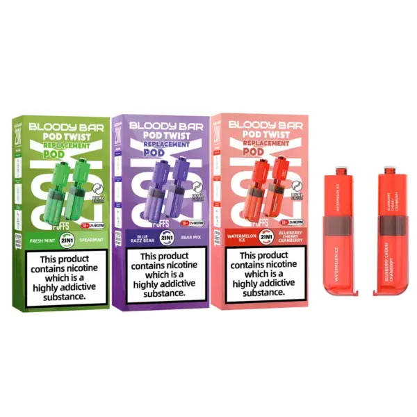 These replacement pods and refill containers are for use with the Bloody Bar Pod Twist 20K prefilled vape starter kit.